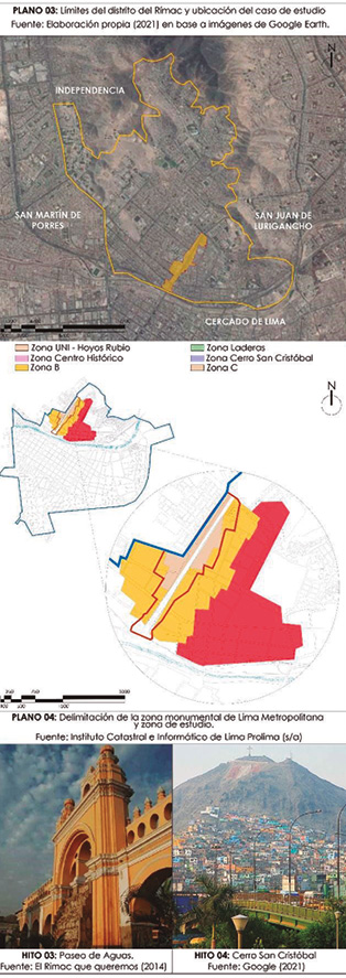 El distrito del Rímac fue creado en 1920. Es una de las áreas más representativas de Lima Metropolitana. Se ubica al noreste de la provincia de Lima, limitando por el norte con el distrito de Independencia y, por el sur, con el Cercado de Lima. Por el este y oeste, limita con San Juan de Lurigancho y San Martín de Porres, respectivamente. La superficie del distrito es de 11.87 km2; con una altitud de 161 m. s. n. m. Según Balarezo (2020), en el Rímac existen seis sectores, los más influyentes para el área de estudio son: la Universidad Nacional de Ingeniería con el Fuerte Hoyos Rubio, la zona urbanizada, las laderas (donde se sitúa el Centro Histórico) y el cerro San Cristóbal (Ver Plano 02 de la Figura 2).