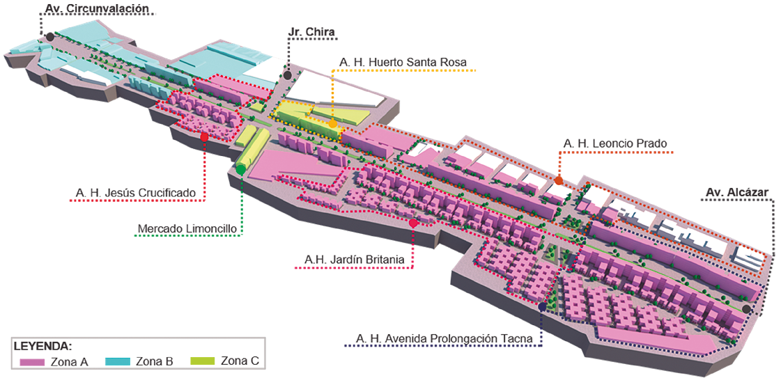 La delimitación del área de intervención estuvo compuesta por inmuebles o predios ubicados a lo largo de la avenida Prolongación Tacna, desde la avenida Circunvalación (altura del puente Santa Rosa), hasta la intersección con la avenida Alcázar, incluyendo predios con frente a los jirones Chira y Tumbes, que articulaban con áreas monumentales como la Quinta Presa y la Alameda de los Descalzos (ver Figura 8 y Tabla 1).