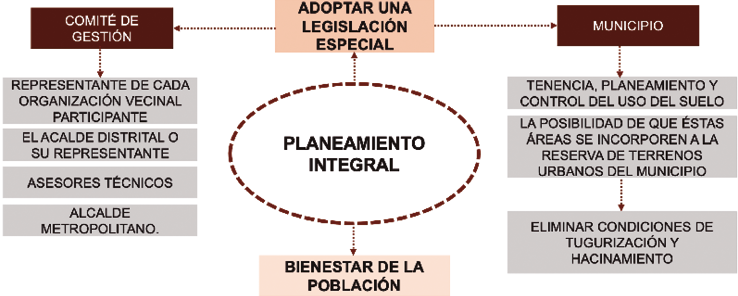 En tanto, en el Perú se dieron cuerpos normativos que, según Martínez (2011), abarcaron pautas de intervención sobre áreas urbanas afectadas por la sobreexplotación de su suelo y los servicios públicos que proveen, instando a una recuperación integral de las mismas, comprendiendo no solamente el aspecto físico o material de su reconstrucción, rehabilitación o remodelación”1 (Ley N.° 29415, art. 11), sino también la recuperación social de sus habitantes.