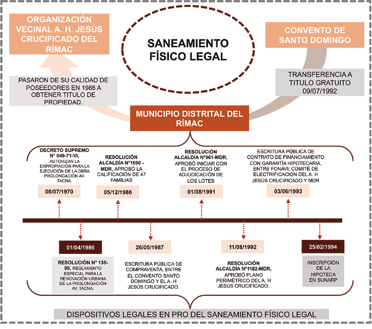 Asimismo, la resolución señala que la propiedad de las áreas comprendidas en la zona A deberá ser transferida al Concejo Provincial, debiendo actuar en los casos que fuera necesario como entidad expropiante, en conformidad con lo dispuesto en los artículos 75 y 76 de la Ley Orgánica de Municipalidades. De acuerdo con ello, el A. H. Jesús Crucificado del Rímac, del subprograma de la zona A, logró el saneamiento físico legal de cada uno de sus lotes (ver Figura 12).