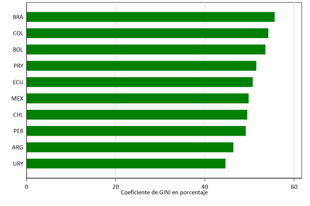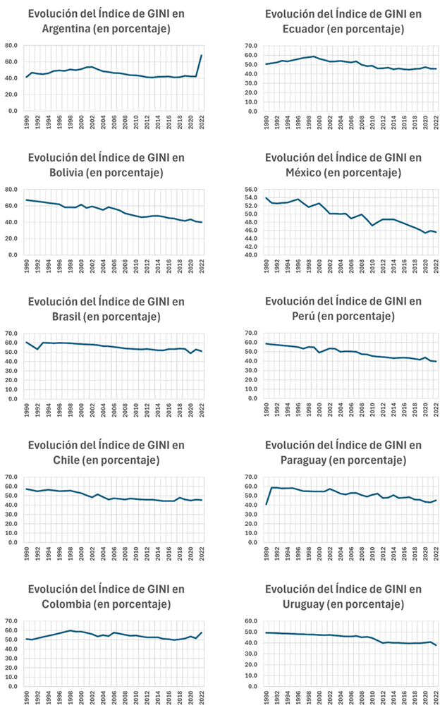 Para evaluar esto, el índice de Gini, que cuantifica las asimetrías del ingreso, se considera la medida más adecuada, sin tener en cuenta otros aspectos multidimensionales. Los valores más cerca de cero suelen indicar un mayor nivel de equidad, en tanto que los valores cercanos a 100 sugieren un mayor grado de desigualdad. Múltiples estudios han examinado la conexión entre este indicador y factores como el crecimiento de la economía, los grados de pobreza, las tasas de desempleo y el gasto gubernamental en educación. Sin embargo, la intrincada interacción de estos factores, junto con las características distintivas de cada nación latinoamericana, hacen que sea difícil obtener resultados concluyentes o universalmente aplicables.