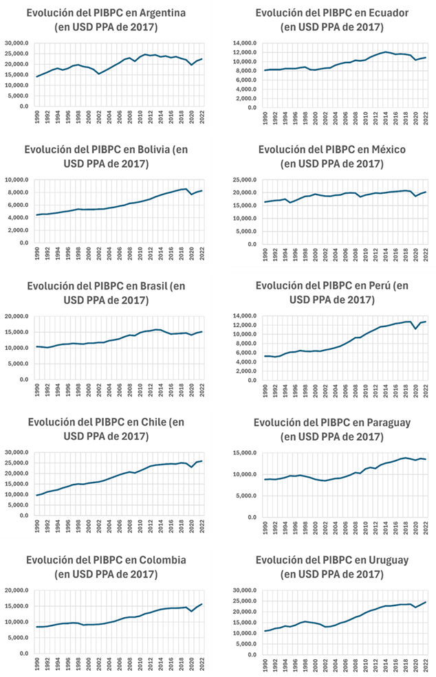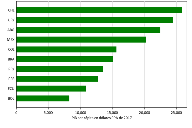 PIB per cápita (PIBPC): indica el ingreso promedio por persona en dólares de 2017, y se utiliza como medida del desarrollo económico de cada país.