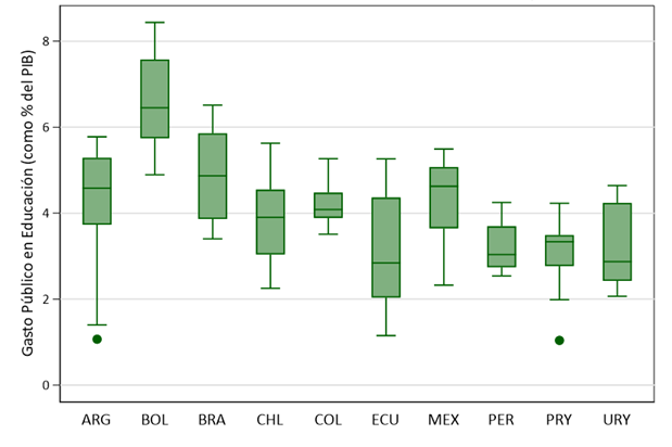 Gasto público en la educación (GPUBED): medido como una proporción del PIB, representa la inversión en capital humano, que se considera crucial para el crecimiento del PIB per cápita en el largo plazo y la reducción de la asimetría en los ingresos.