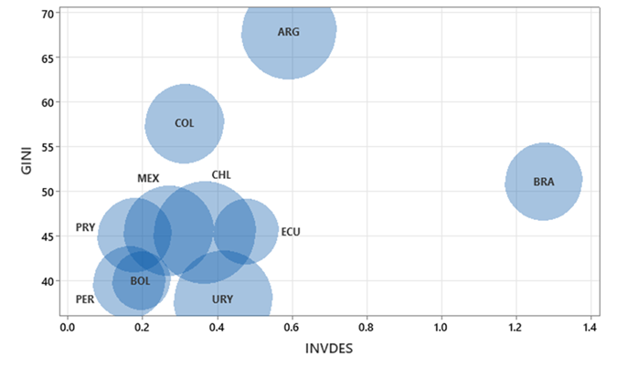 Gráfico de burbuja: GINI vs. INVDES (Tamaño de la burbuja: PIB per cápita)