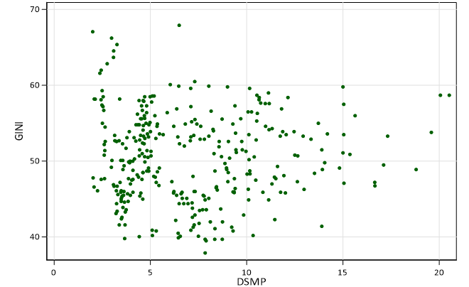 Respecto a la comparación entre el desempleo y el índice de Gini también se observa una considerable dispersión, tal como se presenta en el Gráfico 4.