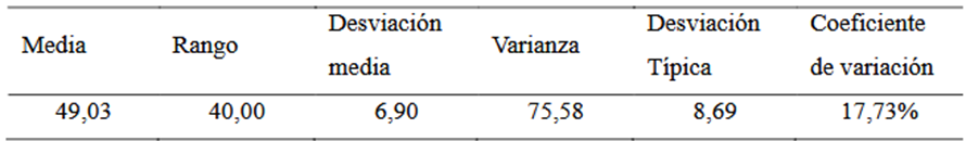 En el cuadro se presentan los resultados de las encuestas realizadas a docentes y autoridades de la UCE, con un total de 362 participantes. La media de edad de los encuestados es de 49 años, con una desviación estándar de 8,69. El coeficiente de variación es del 17,73 %, lo que indica una variabilidad moderada en las edades de los participantes.