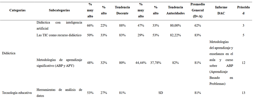A partir de las diferentes dimensiones, se consolidó el análisis cuantitativo y cualitativo para identificar las percepciones sobre las necesidades de capacitación y formación docente. Este análisis consideró las tendencias más altas de las dimensiones y subcategorías, ubicadas entre los niveles “muy alto” y “alto”, además del informe de evaluación del desempeño docente de los últimos cinco años. Los datos se cruzaron con los temas correspondientes a cada subcategoría, finalizando con una columna de prioridades, definida según las tendencias obtenidas.
