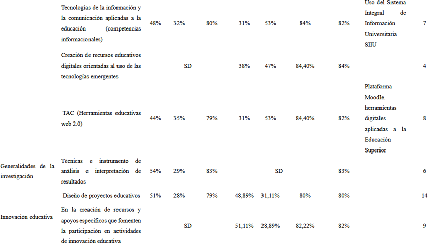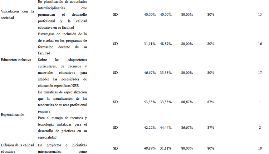 Los resultados han identificado las prioridades más altas, lo que permitiría diseñar una capacitación efectiva con el objetivo de fortalecer los conocimientos y las prácticas pedagógicas de los docentes de la UCE.