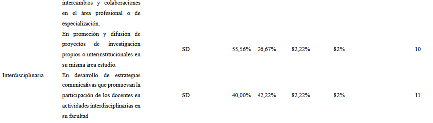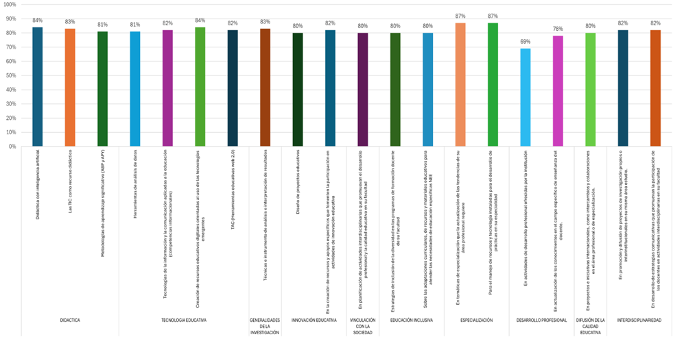 Los principales datos obtenidos del diagnóstico de percepciones sobre las necesidades de capacitación y formación docente muestran una mayor tendencia en relación con la especialización en el área profesional. Esto se debe a que la institución cuenta con diversas áreas del conocimiento y 62 carreras distribuidas en 21 facultades. Un proceso de capacitación y formación contribuye al avance del conocimiento en sus respectivos campos y, a su vez, beneficia la práctica educativa, elevando el nivel de enseñanza y, en consecuencia, la calidad académica.