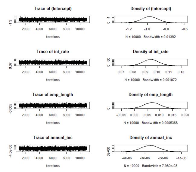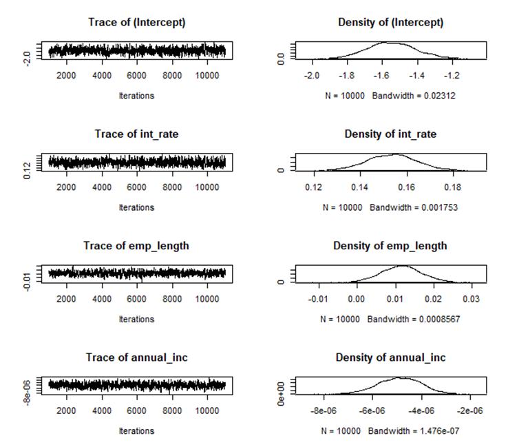 En la figura 2 se exhibe la estimación de los coeficientes del modelo estadístico de regresión logit bajo el enfoque bayesiano, obtenida mediante la simulación MCMC utilizando el algoritmo de Metropolis-Hastings. La figura muestra tanto las cadenas generadas por la simulación como las funciones de densidad posterior para cada uno de los coeficientes del modelo estadístico de regresión logit.