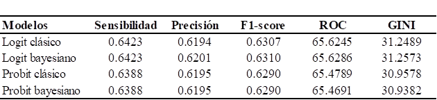 En la Tabla 6 se presenta el desempeño comparativo de los modelos estadísticos de regresión logit y probit, evaluados tanto bajo el enfoque clásico como bajo el enfoque bayesiano. Para la comparación, se emplearon los indicadores estadísticos de sensibilidad, precisión, F1-score, área bajo la curva ROC y GINI, calculados a partir de la muestra de validación. Los resultados muestran que el modelo de regresión logit bajo el enfoque bayesiano alcanzó un desempeño predictivo superior en comparación con los demás modelos considerados.