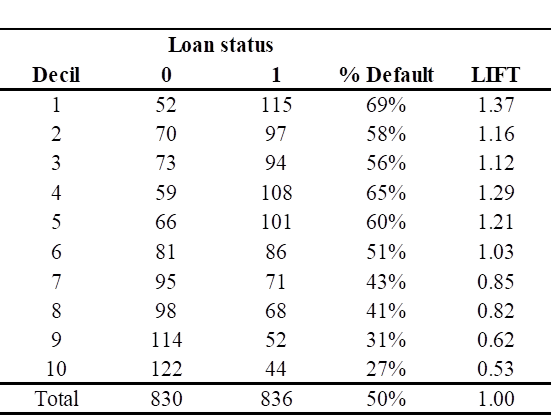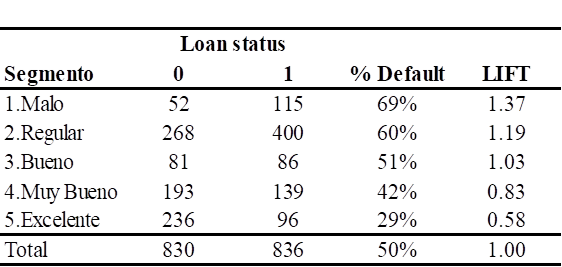 Con los valores obtenidos del credit score, se procedió a segmentar a los solicitantes de préstamos personales en niveles de riesgo crediticio. En la Tabla 7 se presenta la distribución por deciles del credit score, indicando para cada decil el porcentaje de incumplimiento (default) y el valor del indicador de lift, calculado como la relación entre el porcentaje de incumplimiento de cada decil y el porcentaje de incumplimiento total de la muestra; esta información permitió identificar los deciles asociados a distintos niveles de riesgo, facilitando la categorización de los solicitantes y la implementación de estrategias diferenciadas de gestión del riesgo crediticio, tales como la asignación de tasas de interés, montos de préstamo y requerimientos de documentación en función del perfil de riesgo.