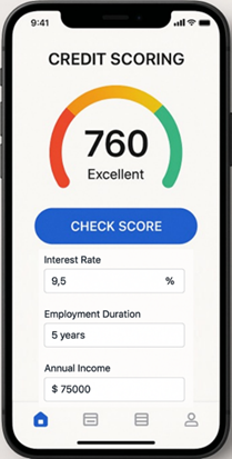 Finalmente, se propone el diseño de una aplicación móvil que integre y ponga en producción el modelo estadístico de regresión logística bajo el enfoque bayesiano. Para ello, se sugiere la implementación de una API en la nube que permita el ingreso de las variables int_rate, emp_length y annual_inc, garantizando así la evaluación en tiempo real de los solicitantes de préstamos personales. La Figura 6 presenta el diseño conceptual de la aplicación móvil para la valoración del credit scoring.