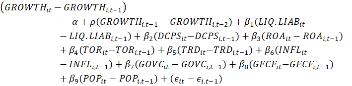Findings obtained from the system GMM estimation approach reveal that most variables—namely L.GROWTH, LIQ.LIAB, TOR, TRD, GFCF, and ROA—exert a positive influence on overall economic performance. In contrast, DCPS and POP display an adverse relationship with overall economic performance. The estimated coefficient for L.GROWTH (0.3439) indicates that previous income growth per person exerts a statistically significant and positive influence on its current level. Specifically, a 1% rise in the lagged growth rate is linked to an approximate 0.344% increase in present income growth per person, holding other determinants constant. The estimated parameter for LIQ.LIAB (0.0074212) indicates a positive association with the outcome variable. By contrast, the coefficient on DCPS suggests that a higher volume of financing extended to private economic agents may be related to a slower rate of income growth per person. Findings indicate that a 1% rise in financing directed to private economic agents is associated with an approximate 0.024% decline in income per person. Comparable evidence is reported by Cournède et al. (2015). In addition, return on assets demonstrates a direct relationship with overall macroeconomic performance. Other influential factors holding same 1% increase of returns on assets in the Asian countries may increases GDP growth by 0.52 %. The economic impact of banks becoming more profitable is positive, as evidenced by the fact that for every 1% increase in return on assets (ROA), GDP per capita rises by 0.52%. This relationship suggests that more profitable banks, with greater capital on hand, have stronger incentives to effectively screen and monitor loans. Consequently, firms become more capable of mobilizing funds efficiently within the productive system. Moreover, the turnover ratio (TOR), which reflects the intensity of trading activity in the stock market, proves to be significant in the estimated models. The direction and relevance of the turnover coefficient are consistent with the evidence reported (Beck et al., 2004). Evidence indicates that a higher level of trading activity in equity markets is associated with an expansion in output per person. Specifically, a 1% rise in this trading intensity measure corresponds to an approximate 0.006% increase in output. These results are consistent with the conclusions reached by Beck et al. (2004), as well as by Valickova et al. (2015).